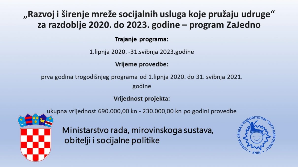 Ministarstvo za demografiju, obitelj, mlade i socijalnu politiku financira trogodišnji program udruga koje djeluju u području socijalne skrbi pod nazivom „Razvoj i širenje mreže socijalnih usluga koje pružaju udruge“ za razdoblje 2020. do 2023. godine kojim financira udruge koje se bave socijalnom i humanitarnom djelatnošću, udruge osoba s invaliditetom i udruga koje djeluju u korist